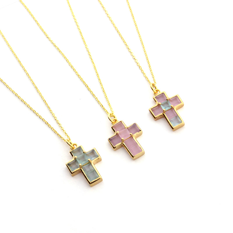 Crisol is a necklace that will make a difference in your look with a touch of elegance and sophistication. The pendant is a cross with colored stones that makes this jewel have a lot of personality and style.