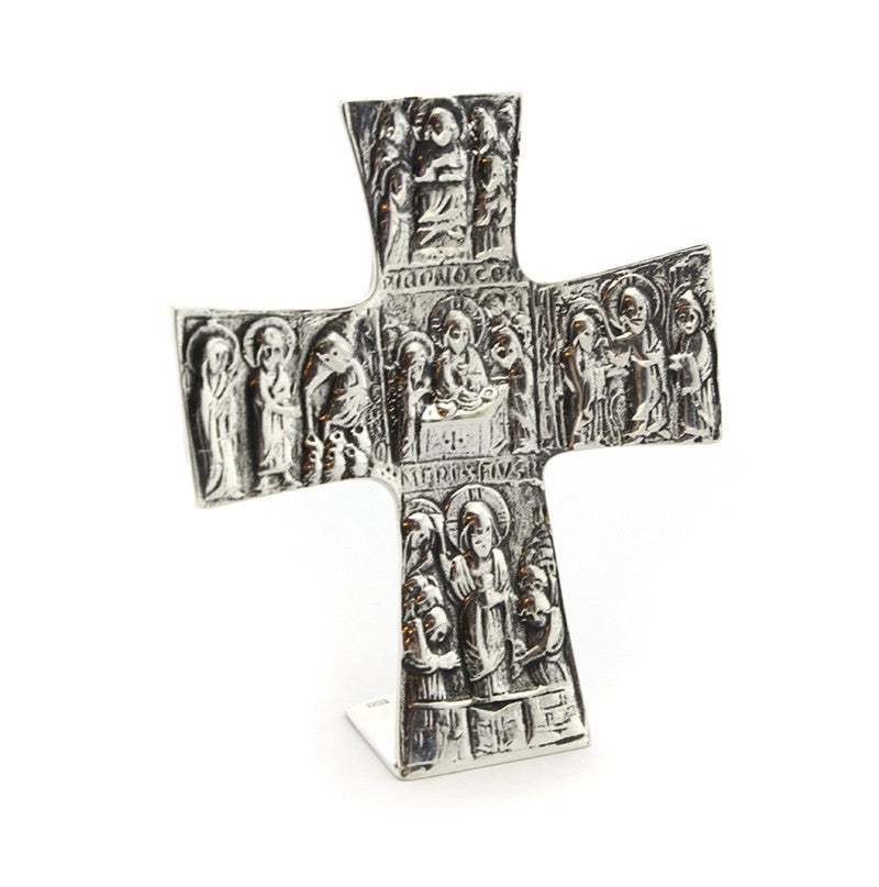 Beautiful 925 silver table cross with biblical scenes in relief.