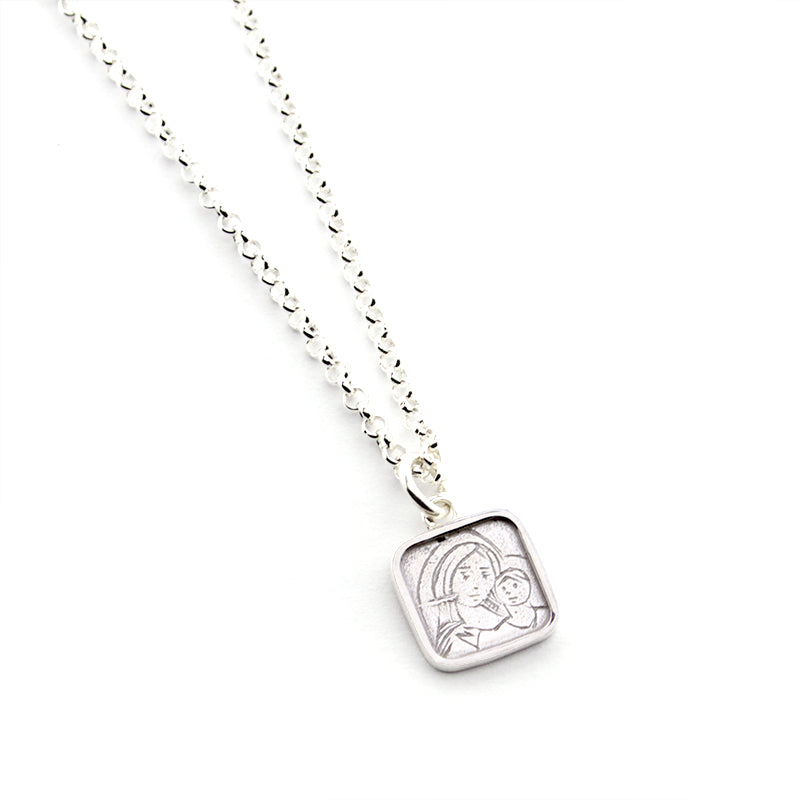 Necklace with a silver chain and a square scapular medal made of 925 silver. The Virgin of Carmen and Child are engraved on one side and the Sacred Heart on the other. Ideal for boys on their first Communion or Confirmation.