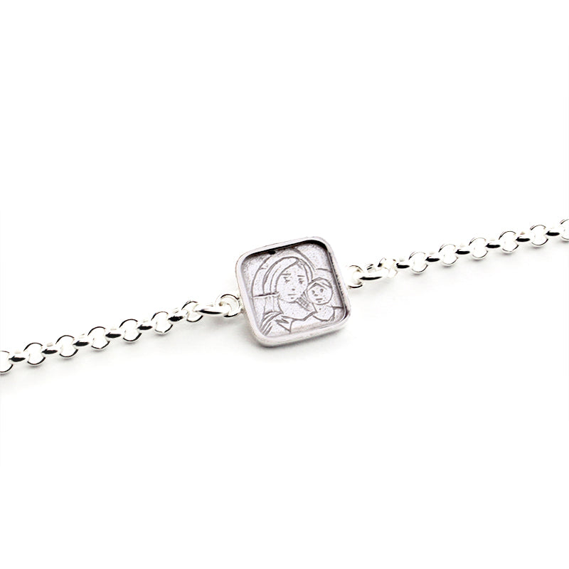 Bracelet with a silver scapular medal, 13 x 13 mm square, with a drawing of the Virgin of Carmen on one side and the Sacred Heart on the other. Small, comfortable, easy to combine and with a special touch due to its shape.