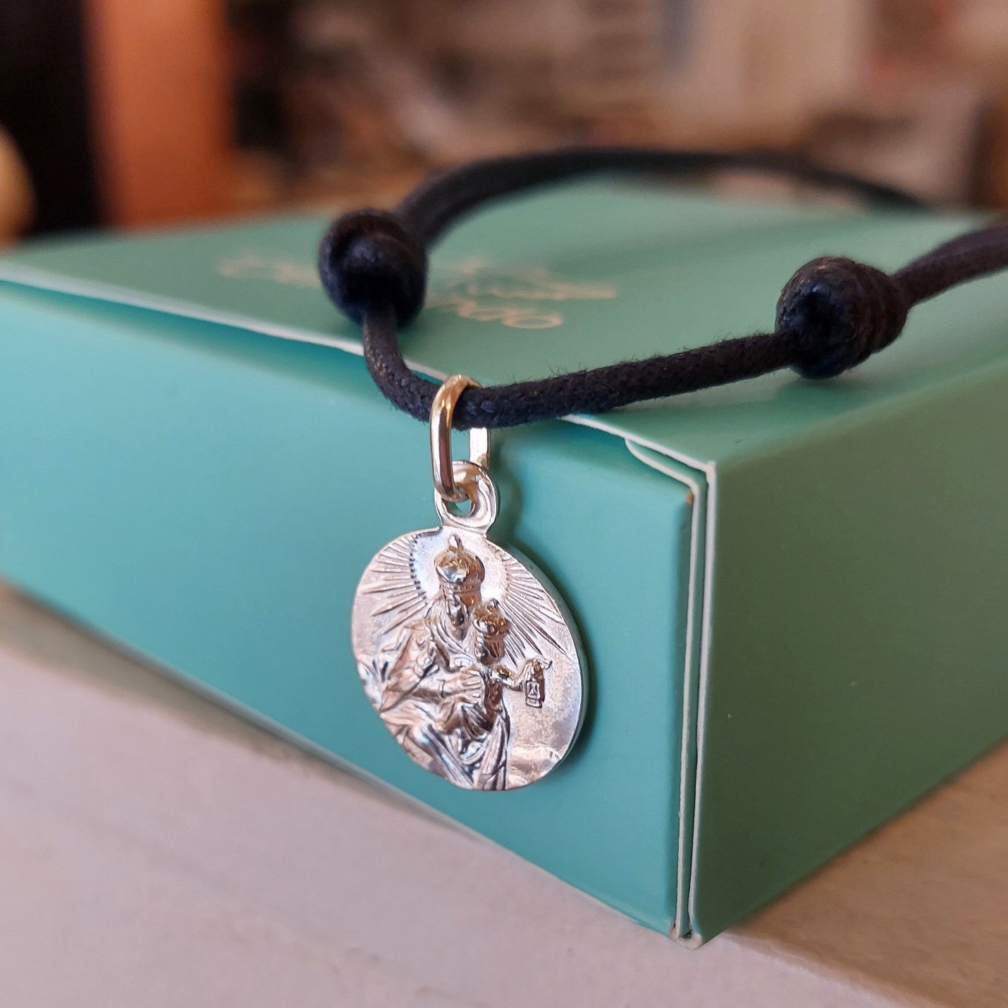 This silver scapular medal is mounted with our cotton that simulates leather and its sliding knots. The mounting that we present in this model is to replace the chain, it is about falling and you wear it at chest height.