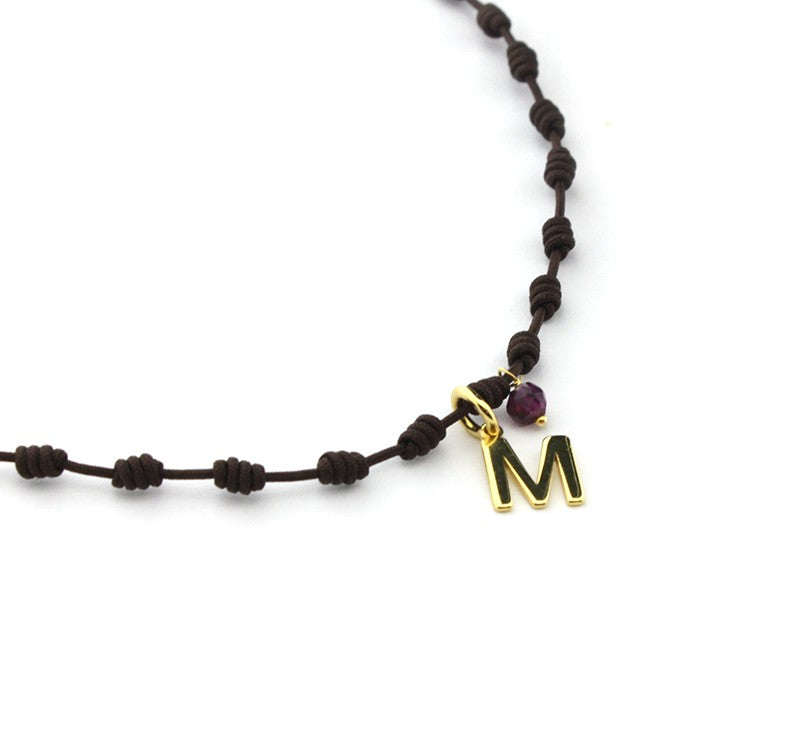 Our classic Olaya necklace made up of a series of base knots with a gold-plated silver initial and a small stone depending on the shade of the thread (The color of the stones is not guaranteed).