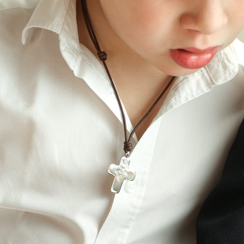A very special .925 silver cross with a beautiful image of the Sacred Heart. Thanks to its sliding knots, the necklace is adjustable and can be worn at the height that suits them best. And to make it a keepsake for life, you can personalize it by engraving the name and/or the date of their First Communion, Confirmation...