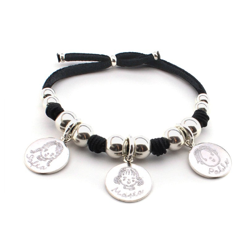 The SARA bracelet is very original because of the children's drawings that you can choose for each medal. It is ideal if you want to make a very special gift to a mother, grandmother, aunt... so that she can wear, on a personalized bracelet that is comfortable to wear thanks to the adjustable elastic band, different medals with the names and/or dates of her children, grandchildren, nephews...