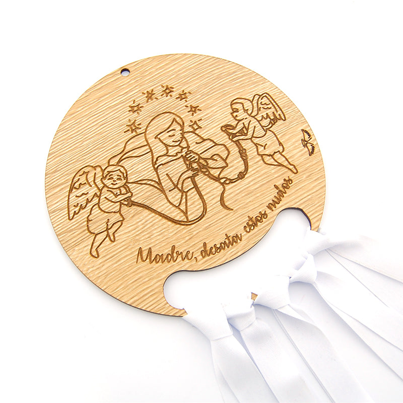 Como nos gusta mucho y creemos que es de gran utilidad, hemos pensado y diseñado este "medallón" de madera, para que teniéndolo en casa se le puedan presentar a la Virgen "nuestros nudos" y que Ella los desate. Por eso en la parte de abajo van colgando unos cordones de colores, para que escribas en ellos lo que necesites pedirle o simplemente anudes el cordón dirigiendo tu petición a la Virgen. Cuando Ella lo resuelva, que lo hará, lo desatas.