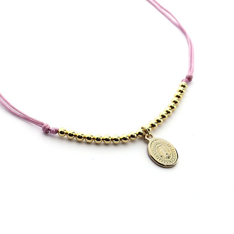 Collar de la Virgen de Guadalupe con veinte bolitas doradas y cordón con cierre regulable. Lleno de color y brillo es una manera muy bonita de lucir a la Virgen.