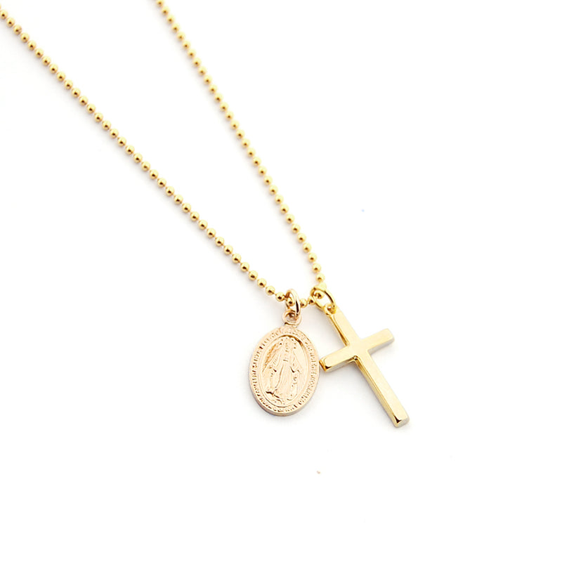 Cadena con medalla Milagrosa, en su versión clásica y preciosa, con la cruz. Un collar completo, para los que les gusta llevar de una sola vez todas sus devociones. Queda muy bonito y se puede escoger en dos medidas de largo de cadena.