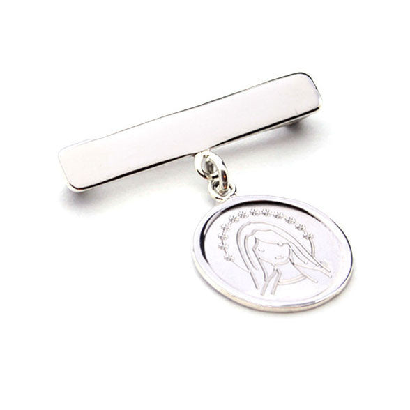 Aguja con Medalla de la Virgen con niño grabada en Plata de Ley .925. En la aguja es posible grabar un nombre, asi como en el reverso de la medalla. Es perfecta como regalo de Bautizo.