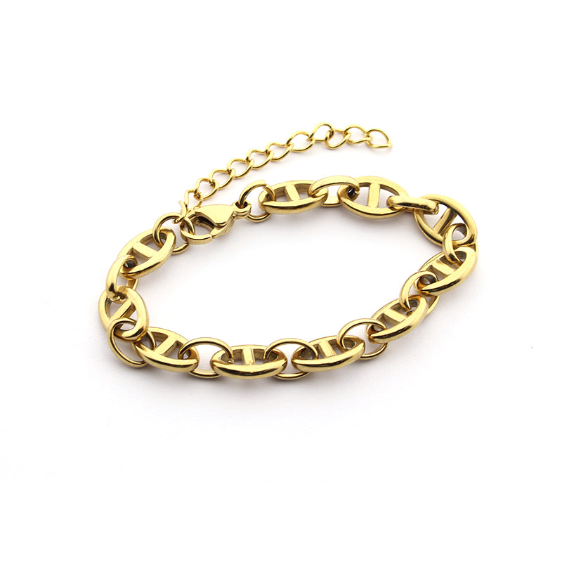 Este modelo BELA es una pulsera de cadena estilo calabrote dorada que se asentará en tu muñeca de forma elegante y sofisticada. Su acabado reluciente todavía lo hace más especial y único.
