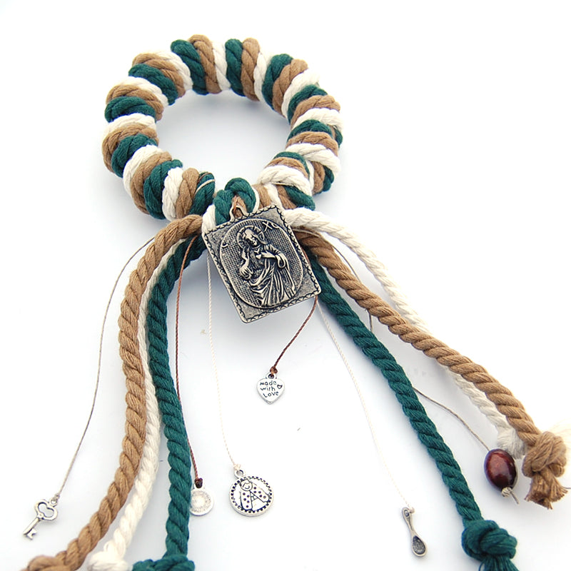 En Tu Cielito Lindo hemos pensado juntar la antigua costumbre española de colocar al Sagrado Corazón o el San Benito en la entrada de casa con este adorno de varias cuerdas anudadas, de las que cuelgan abalorios alusivos a la familia, salud etc....