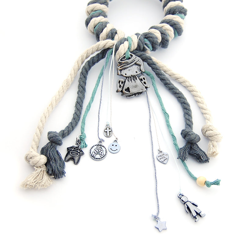 Después de ver el éxito que tenía la bendición de la casa, una de las tradiciones más importantes es la bendición de los niños. Así que a modo decorativo diseñamos un colgante para cuna, armario o cualquier pomo, con abalorios de motivos infantiles y religiosos. La oración que acompaña al colgante nos quedó tan bonita que acaba de completar el regalo para un nacimiento.