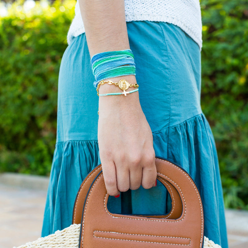El conjunto CARTAGO diseñado para complementar tu look veraniego con elegancia y significado. Perfectas para llevar solas o combinadas, estas pulseras añaden un brillo sutil y un toque espiritual, ideales para disfrutar del verano con estilo y protección.