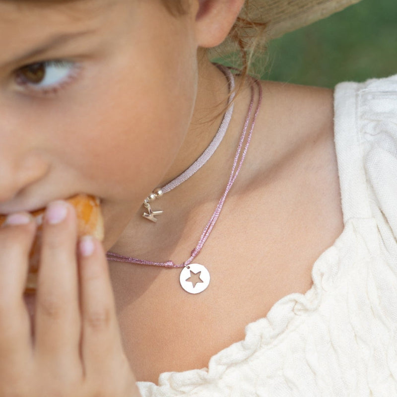 Este set de collares en plata incluye uno con su inicial, uno con la inicial que las representa, y otro con una delicada estrella o cruz con brillante, símbolo de luz y protección. Perfectos para las pequeñas que quieren brillar con estilo y dulzura.