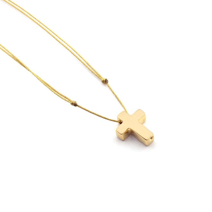 El collar de cruz DAN DOR con cordón en varios colores, resulta fresco y llamativo para lucir en tu día a día. Una cruz gordita en la que además puedes grabar un nombre o una fecha. Ajustable en medida para ir variando según prefieras.