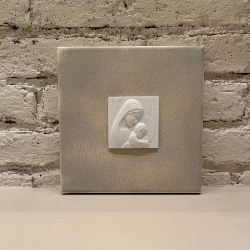Lienzo de algodón de 20x20 cm, pintado a mano en tonos naturales, con pieza cuadrada de la Virgen con el Niño en su regazo, de 6,8 x 6,8 cm .