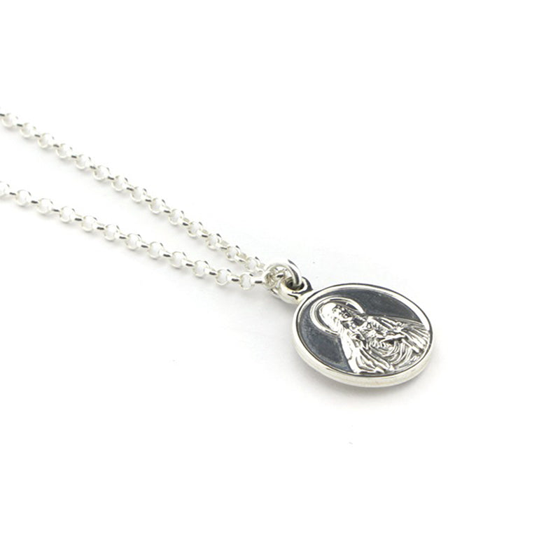 Este escapulario tiene un diseño muy clásico. La medalla es de plata maciza y mide 17mm. En el anverso está la imagen de la Virgen de Carmen y en el reverso el Sagrado Corazón de Jesús. En el lado de la Virgen podemos grabar iniciales o una fecha.