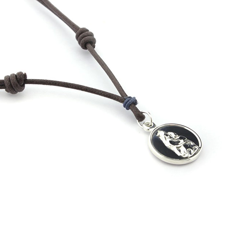 Collar Escapulario montado en cordón con tres nudos. La medalla es de plata y mide 18mm. Además, podemos grabar una fecha o iniciales por el lado de la Virgen.