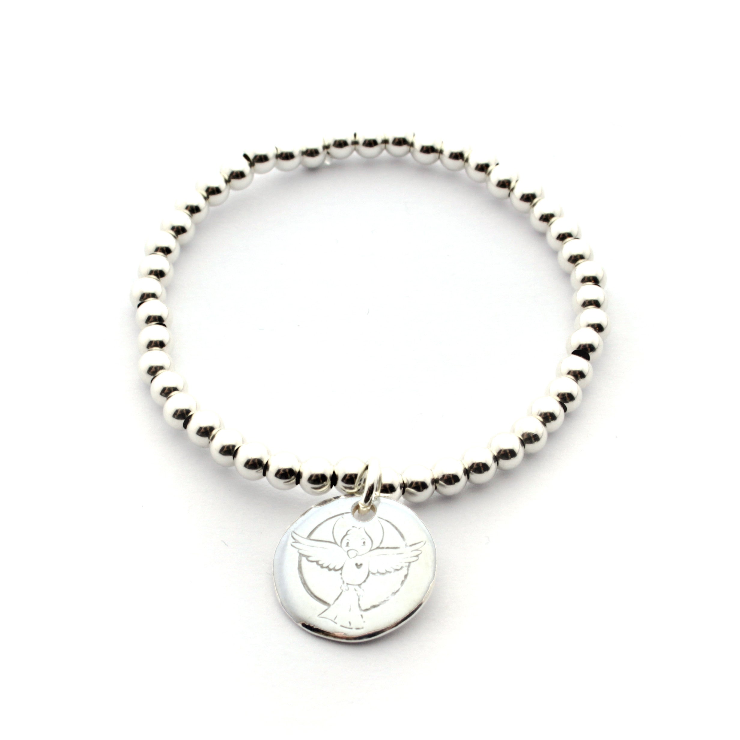 Pulsera de bolas de plata de 4mm con la medalla de 15mm de la Paloma del Espíritu Santo.