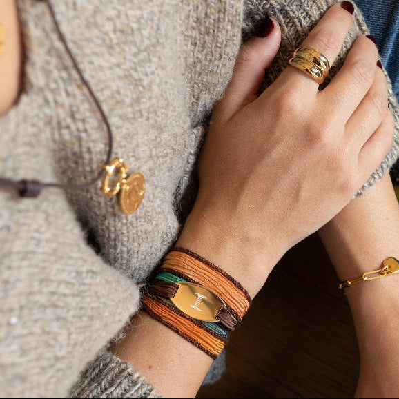 La pulsera GERA es una pieza ovalada de plata con volumen que, montada con esta cinta rizada, hace la pulsera perfecta. La puedes grabar como quieras para darle ese toque personalizado (caben hasta 5 nombres). Queda muy bonita tanto si la llevas sola como si la combinas con otras pulseras.