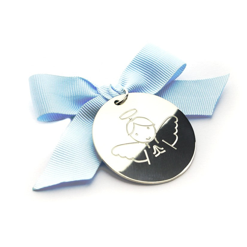 Medalla personalizable de plata .925 que mide 35 mm. Muy bonito para que los bebés lo lleven puesto o para el cochecito, la cuna etc. Escoge el dibujo que quieres que grabemos delante de la medalla. En el reverso se puede grabar el nombre y la fecha del bebé.
