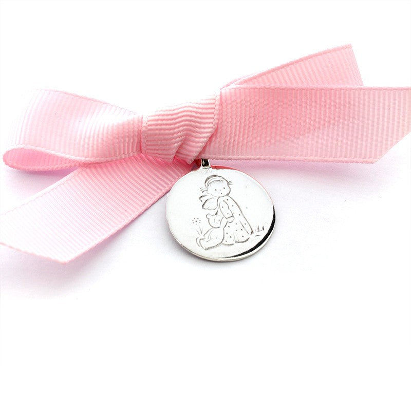 Medalla de cuna Angelito con osito plata de 21 mm de diámetro con el dibujo de una angelita muy dulce con su osito, con un bonito lazo de tela. Ideal para regalo Bautismo. Además, se puede grabar con nombre y fecha o frase corta.