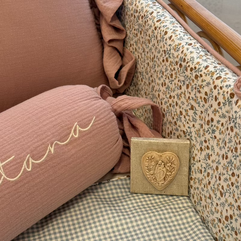 Mini lienzo de algodón, pintado a mano en tonos naturales, con figura de la Virgen y el Niño en un corazón, rodeado de ramitas. Ideal como detalle, tanto en habitaciones como en zonas comunes o despacho. Un guiño a María. Disponible en dos medidas de lienzo: 7x7 cm y 12x12 cm. El corazón mide 5,2 x 4,5 cm.