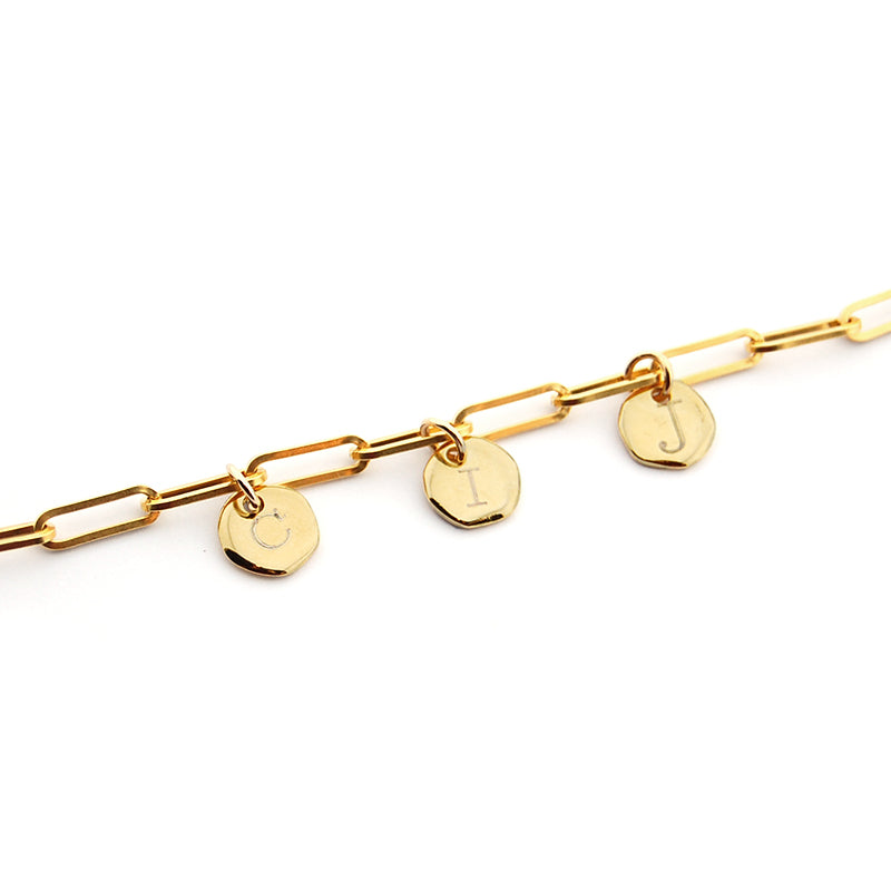 Un diseño elegante y atemporal que combina la delicadeza del dorado con el valor único de la personalización. Cada medalla puede grabarse con la inicial que desees, convirtiendo esta pulsera en una joya cargada de significado.