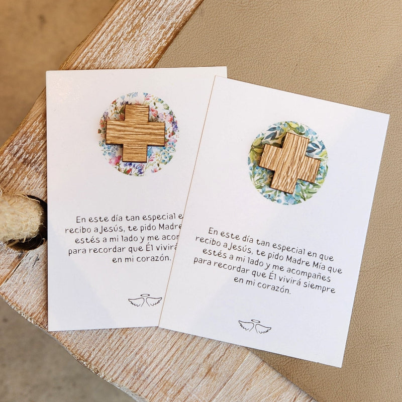 Cada pack contiene 5 o 10 tarjetones con una cruz de madera adherida, listos para regalar.