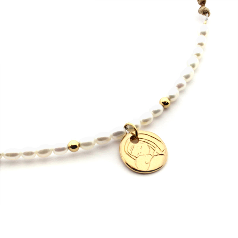 Es un modelo que gusta mucho por el dibujo tan dulcito de la Virgen, que besa al Niño y por su tamaño de 12 mm, que la hace ideal para las niñas más pequeñitas. El collar de perlas con perlas de río y bolitas chapadas en oro le da un toque especial y lo hace adecuado para lucir en ceremonia.