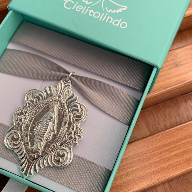 Medalla preciosa de la Virgen Milagrosa para el ramo de novia. Mide 40x56mm. Es una reproducción de la original que se acuñó en la Rue du Bac en París, donde se apareció la Virgen a Santa Catalina Labouré en la Casa Madre de las Hijas de la Caridad.