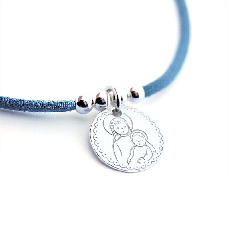 Esta medalla de la colección medallas ARTESANAS triunfa por su dibujo tan dulce y detallado de la Virgen con el Niño rodeados de onditas.